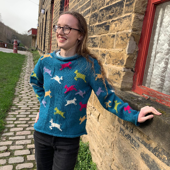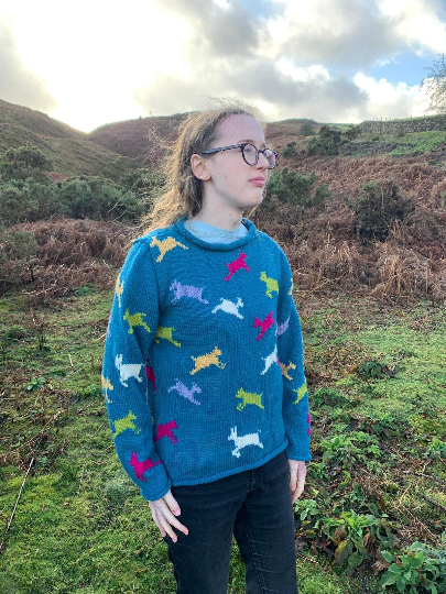 Hand knitted roll top sweater, Dyed in the Wool. Main colour is Saltholme and the leaping sheep are in various different colours.